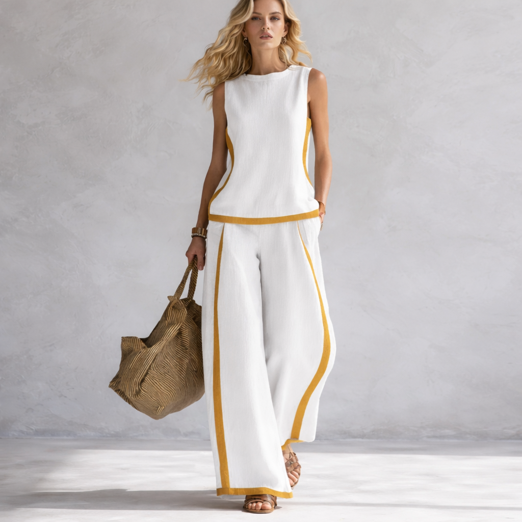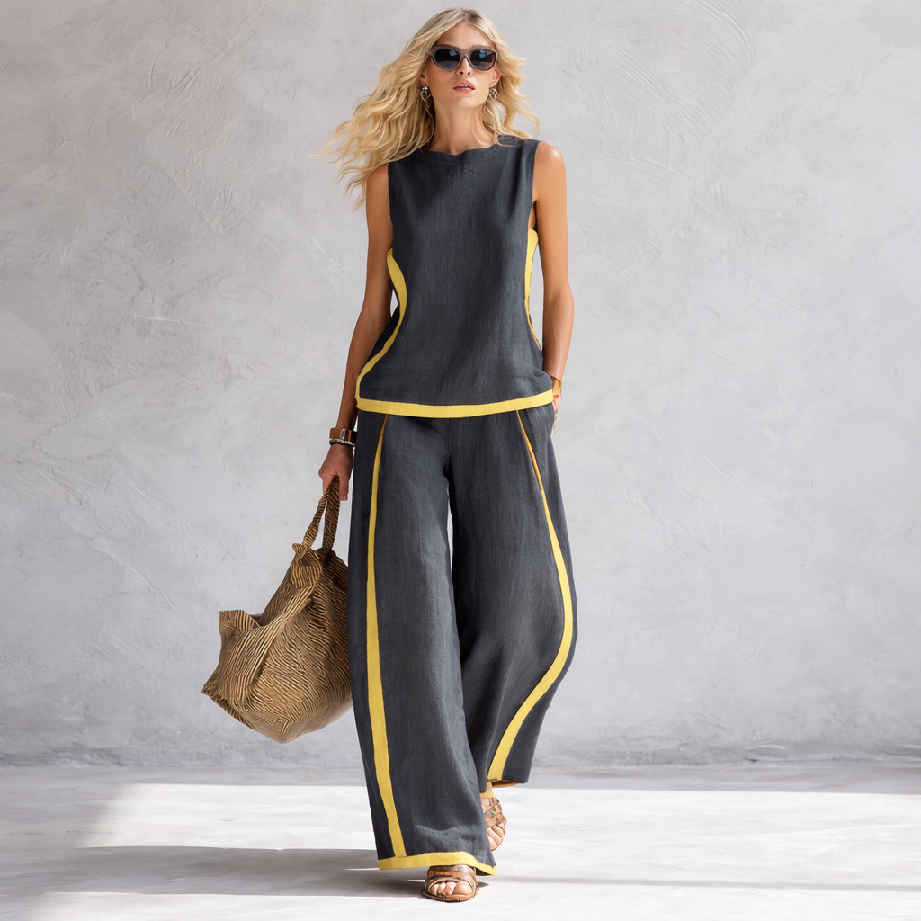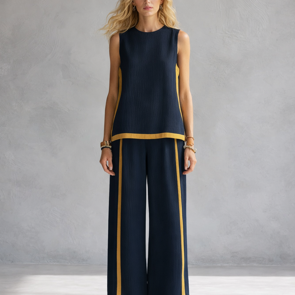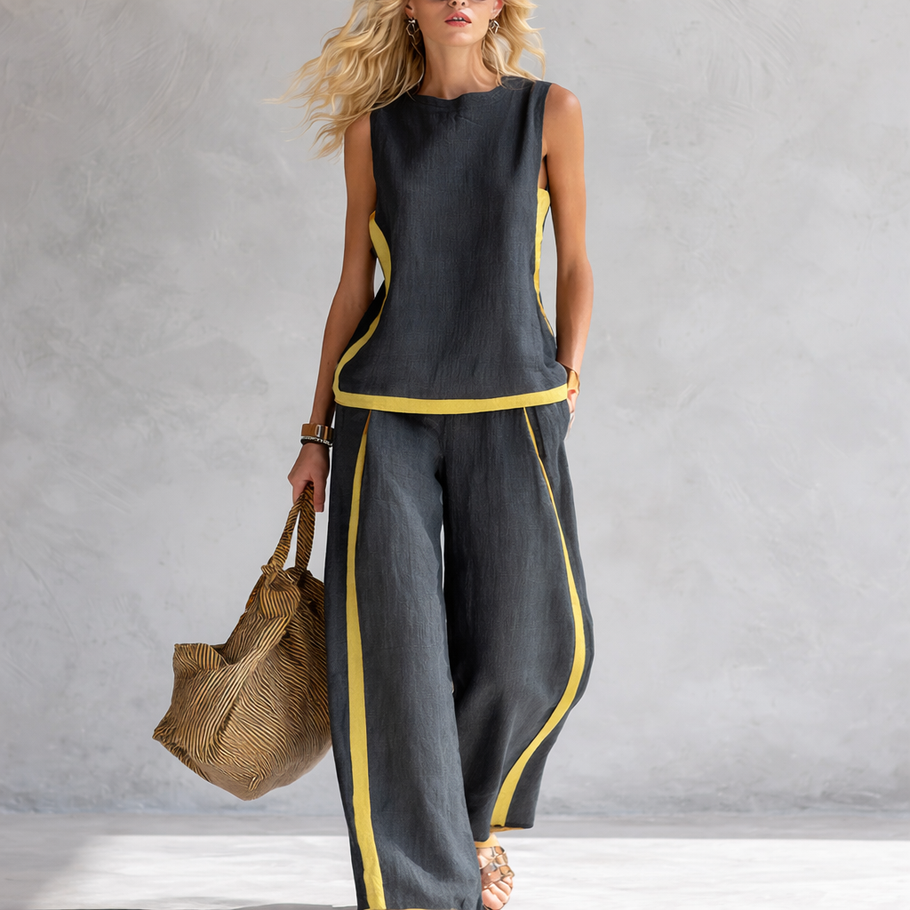 Lehká směs bavlny a lnu působí přirozeně vzdušně a příjemně na těle, zatímco volnější střih zajišťuje maximální pohodlí při každém pohybu. Jemný kontrastní lem dodává celému setu moderní a sofistikovaný vzhled, který působí nenuceně, ale zároveň stylově.